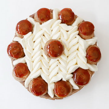 Chou-Chou cake is made of almond brownie base, milk chocolate mousse, profiterol choux with vanilla cream and toffee.